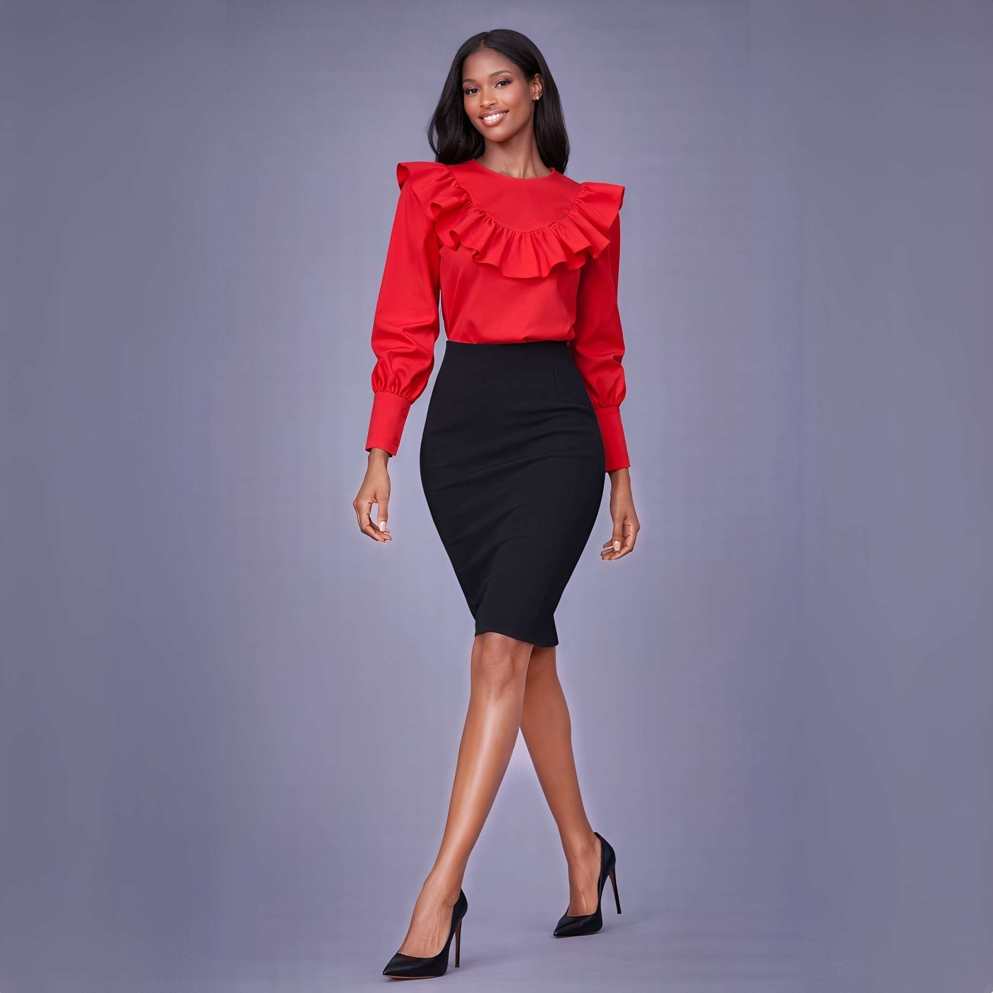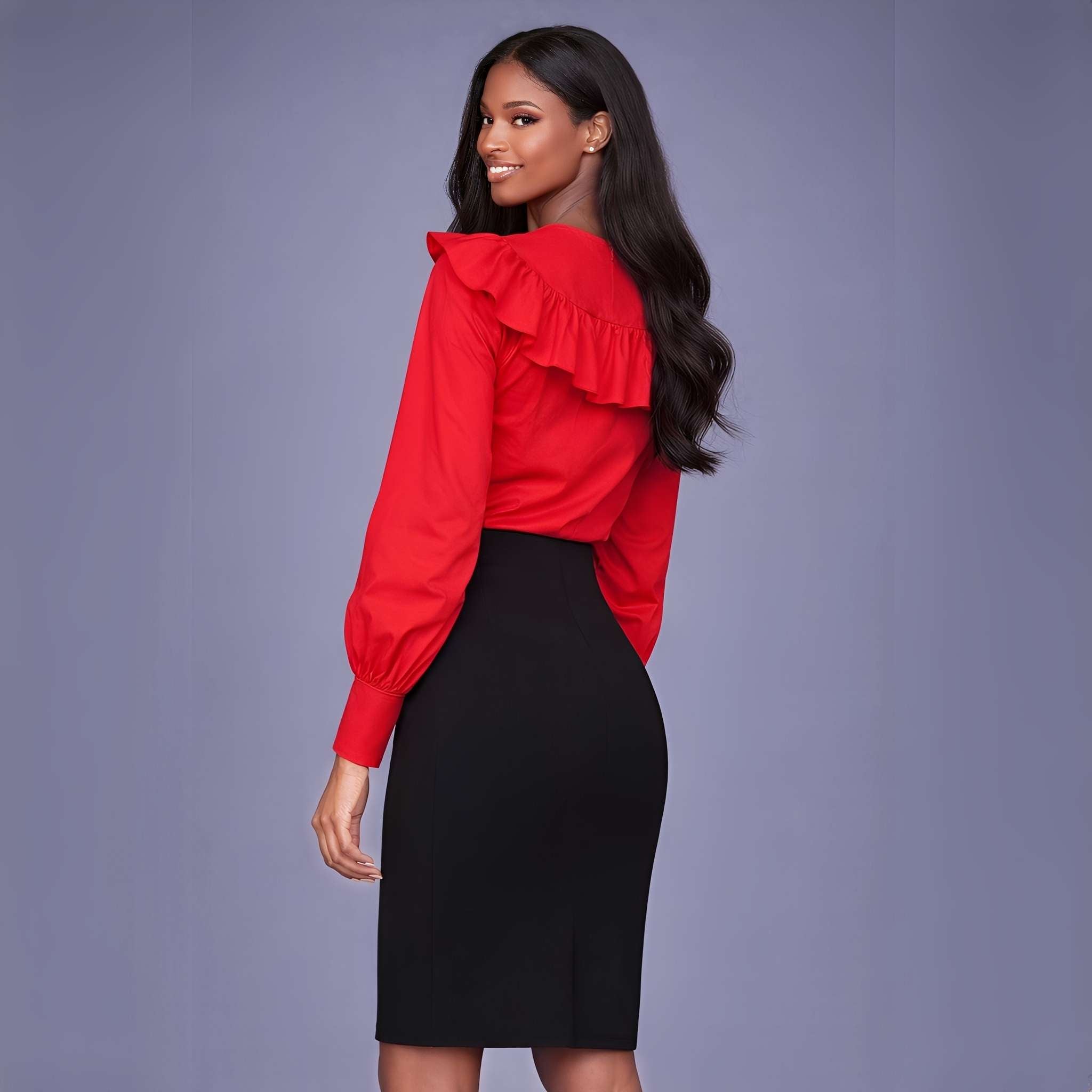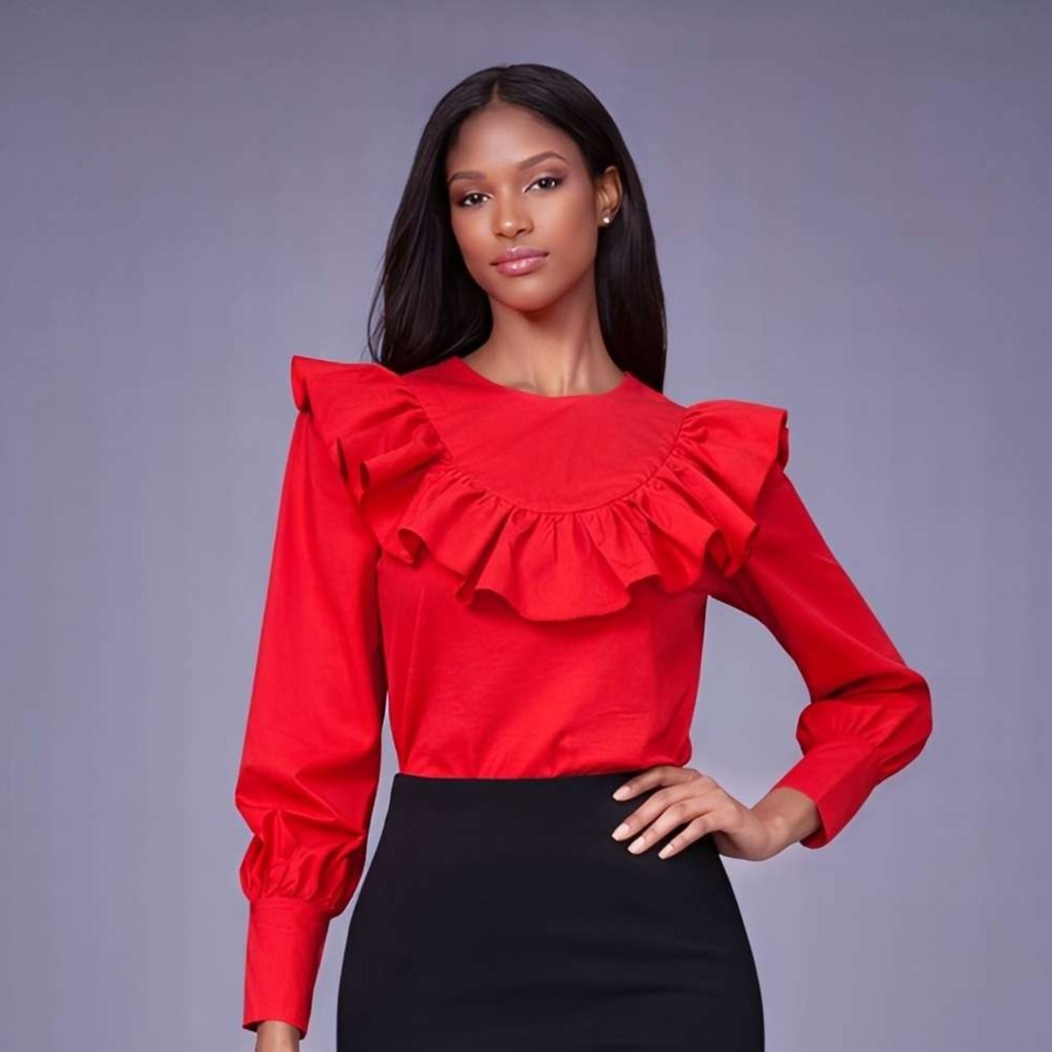 Red Cotton Poplin Shirt with Ruffles on the Bust