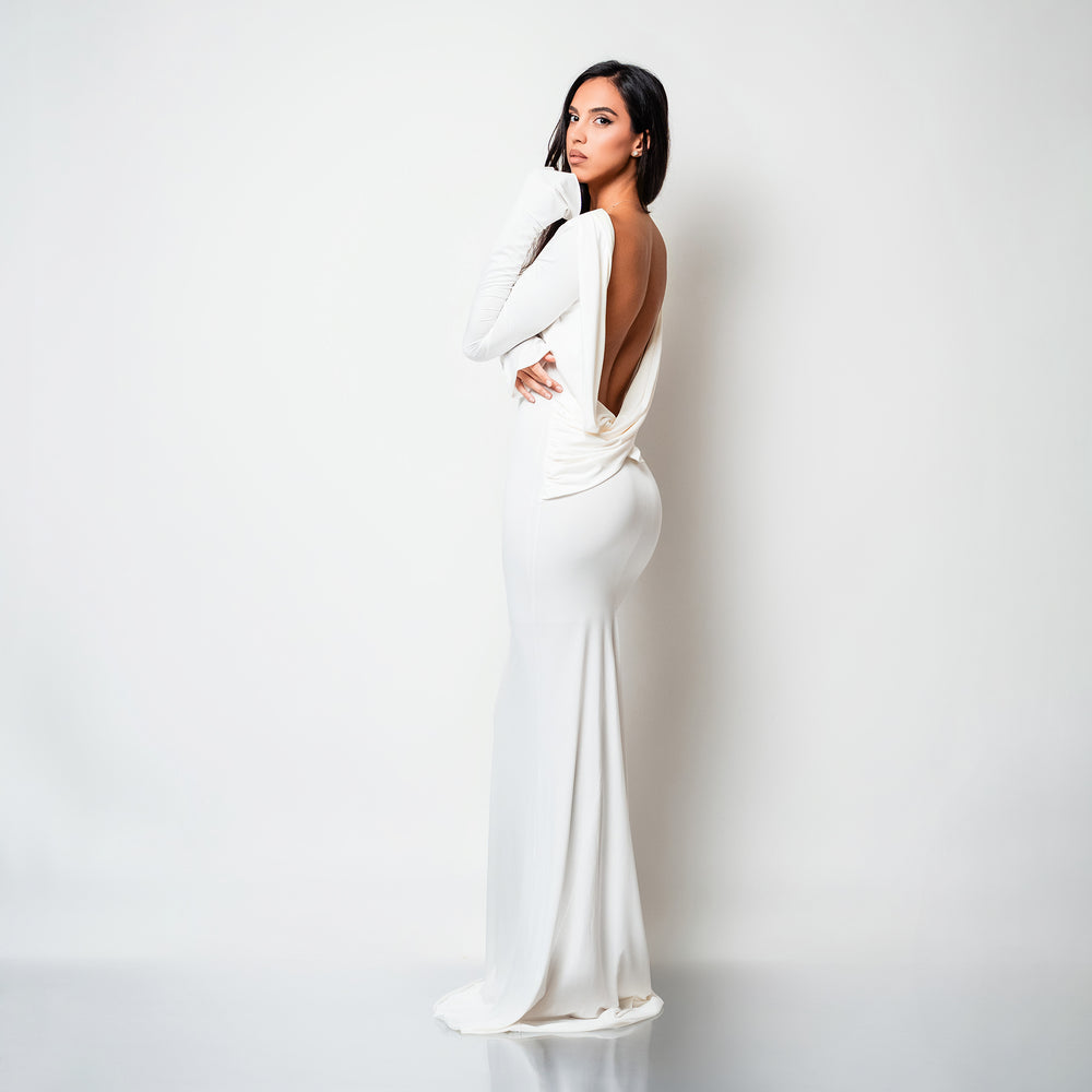 Rochie lunga alba din bumbac de cocktail cu spatele gol si drapaje Luna