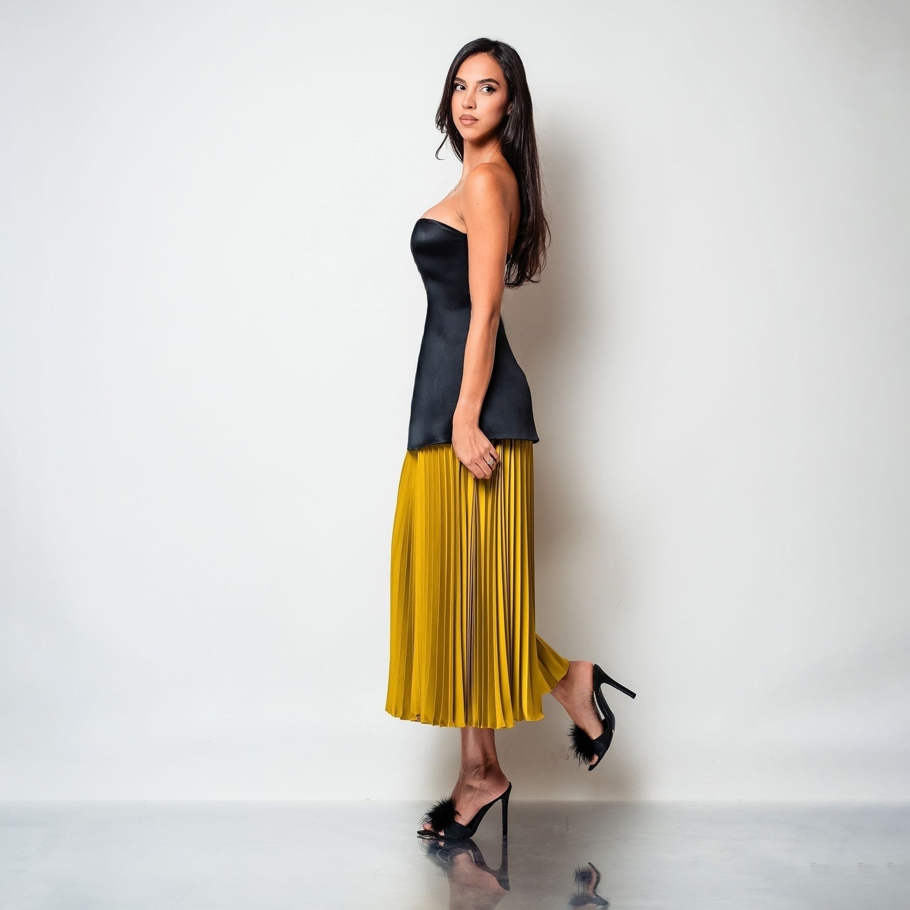 Created for versatility and modern elegance, this two-piece design perfectly blends timeless glamour with contemporary styling. The structured taffeta corset sculpts the silhouette with a refined finish, while the detachable pleated silk skirt adds fluidity and natural movement.